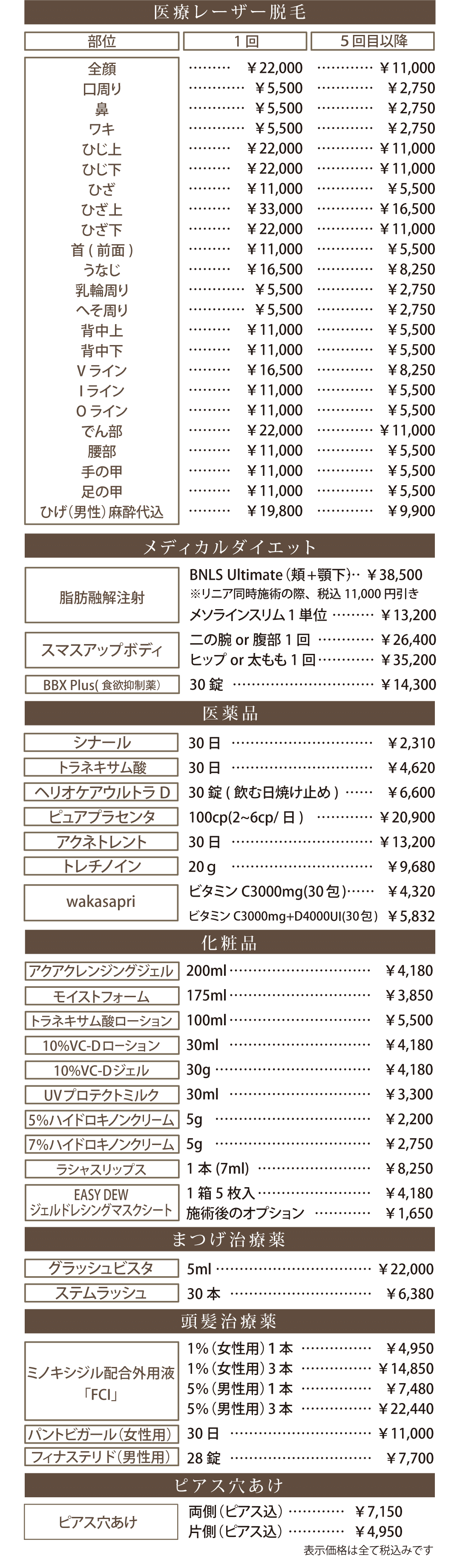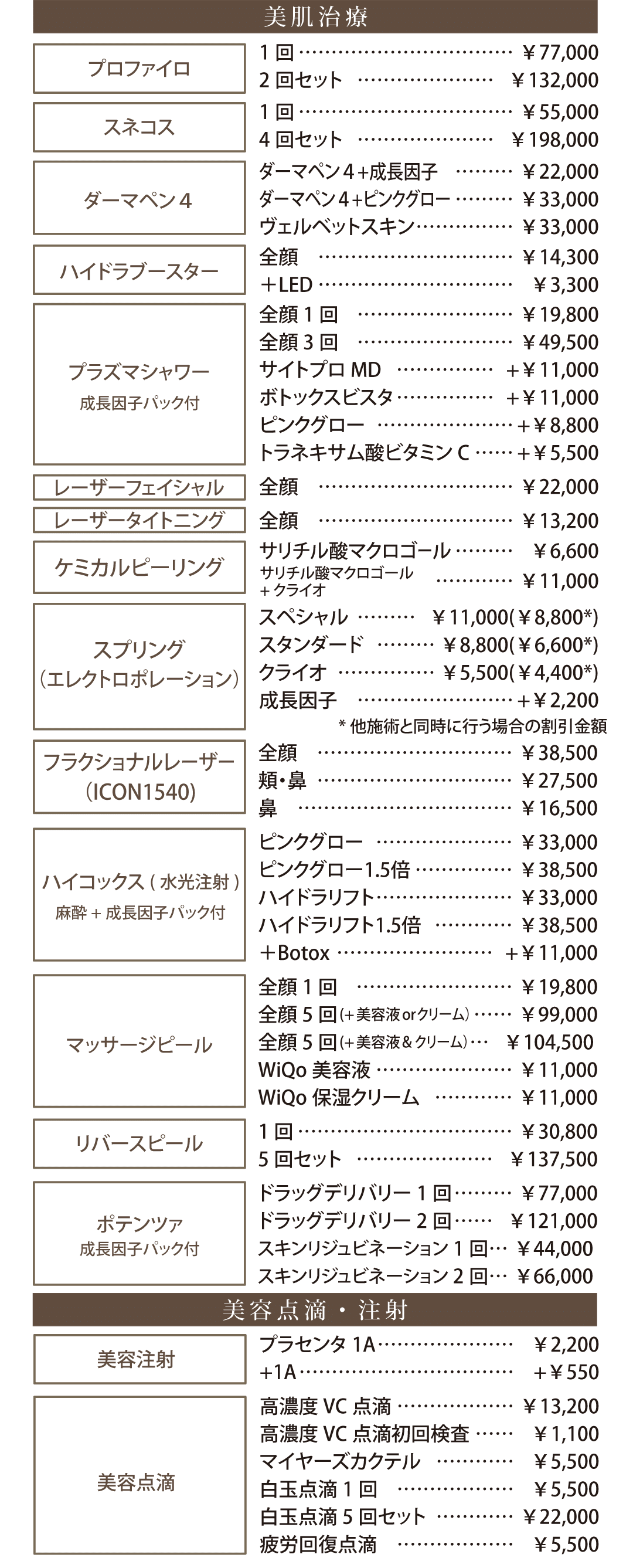 カウンセリング料金 当院がお初めての方 院長 4,400円 非常勤医師 2,200円 再診の方 院長 2,200円 非常勤医師 1,100円 再診の方でカウンセリングを行わない時は、カウンセリング料はかかりません。 当院で初めての治療を行う際はカウンセリングが必要です。 施術料金 医薬品・化粧品値段